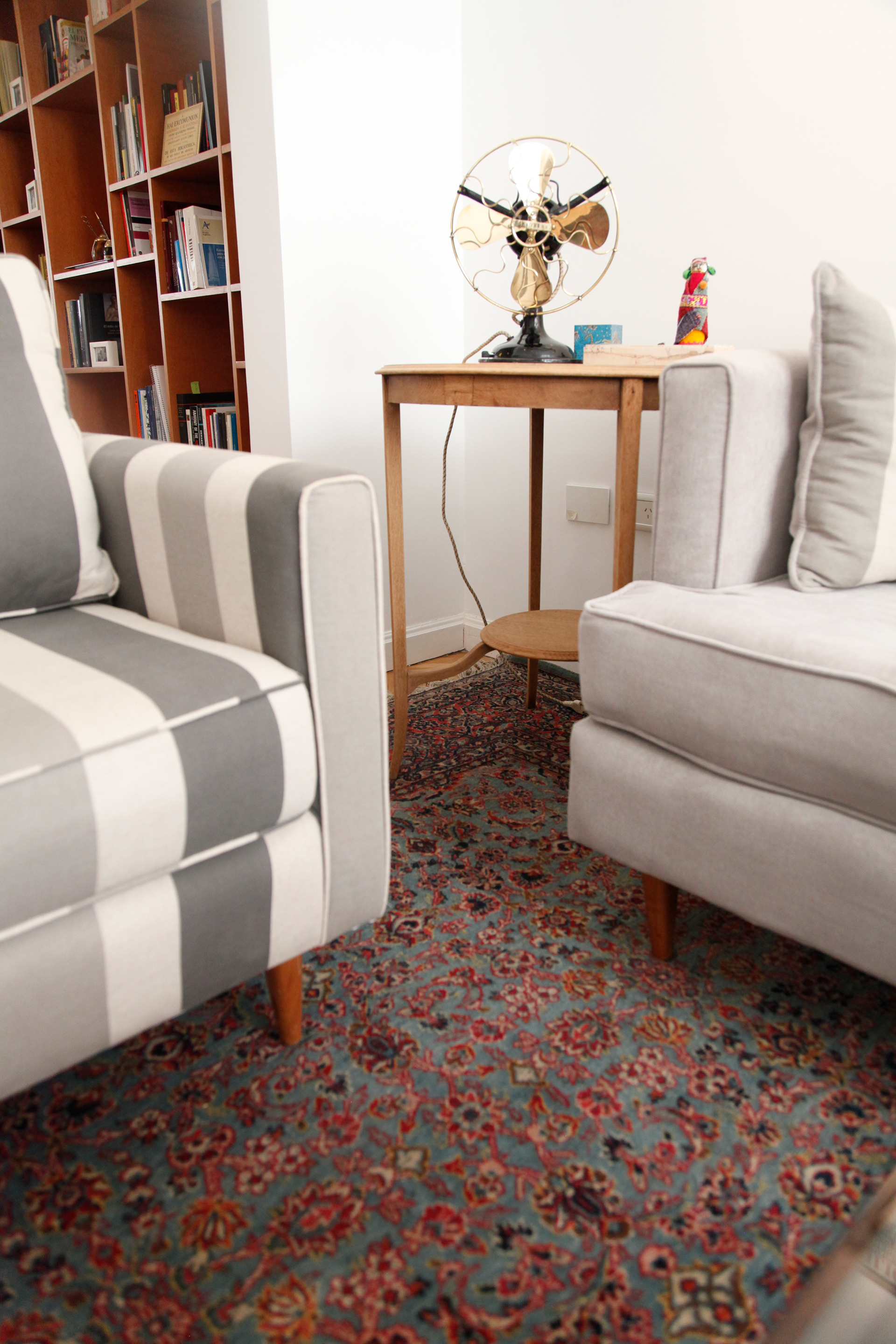 Piso de madera con mobiliario colorido y con textiles estampados.